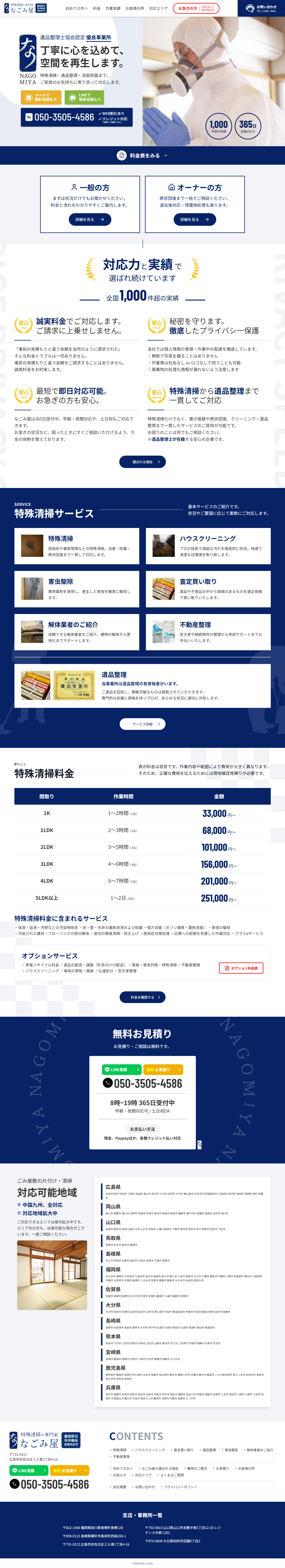 孤独死・事故現場などの特殊清掃、消臭、害虫駆除 ・ゴミ屋敷や汚部屋の片付け・清掃 ・遺品整理や不用品回収、買取査定 ・原状回復やハウスクリーニングなどを専門的に行う「なごみ屋」様のホームページを制作させていただきました。